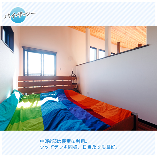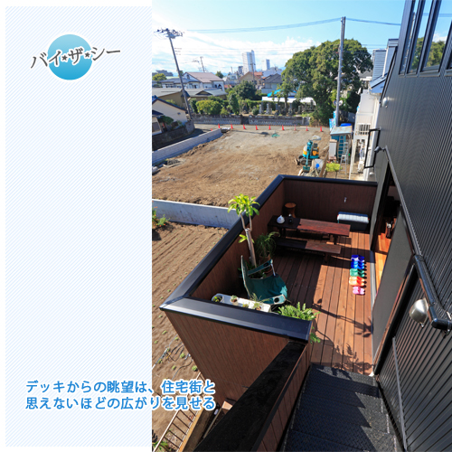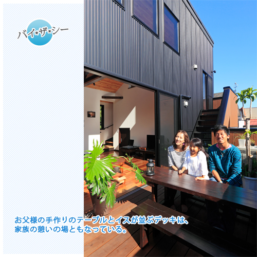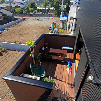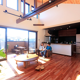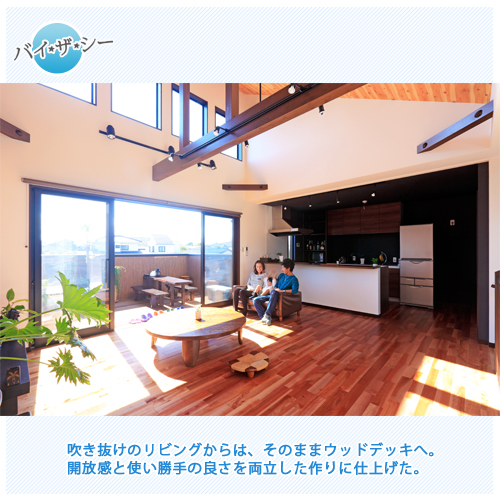 2Fリビングとウッドデッキをメインにした家